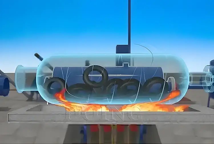 Διαδικασία πυρόλυσης : θέρμανση σε περιβάλλον με έλλειψη οξυγόνου (400-500 ° C) αποσυντίθεται καουτσούκ σε μίγμα πετρελαίου-αερίου, το οποίο συμπυκνώνεται για την παραγωγή καυσίμου. Το χαλύβδινο σύρμα και το μαύρο άνθρακα ανακυκλώθηκαν μέσω φυσικού διαχωρισμού. Μέτρα προστασίας του περιβάλλοντος :